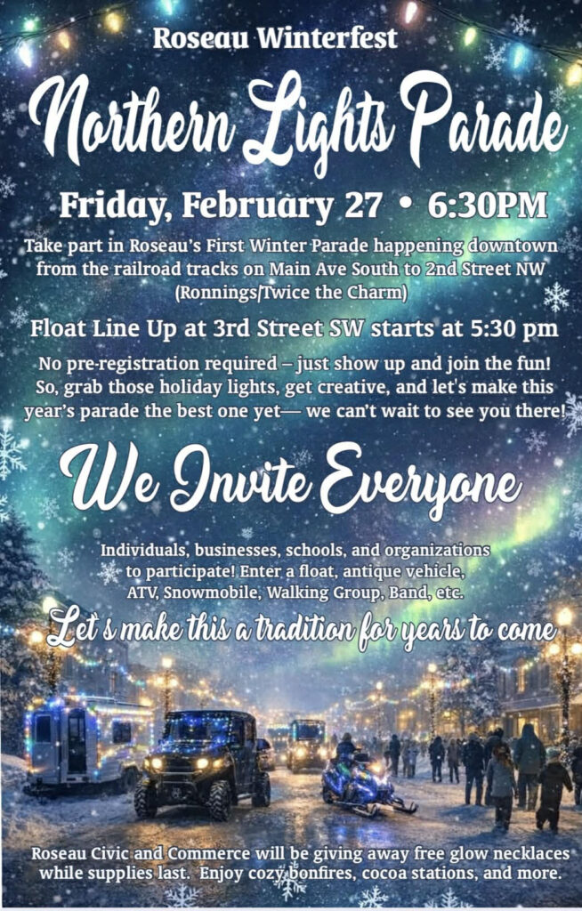The Roseau Civic and Commerce are preparing for Winterfest 2026, highlighted by the city’s first-ever Northern Lights Parade. The winter parade will take place Friday, February 27, starting at 6:30