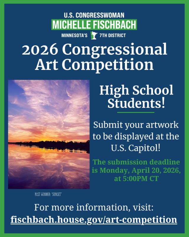 Minnesota Congresswoman Michelle Fischbach of Minnesota’s Seventh Congressional District is encouraging local high school students to take part in this year’s Congressional Art Competition. The annual, nonpartisan contest gives young
