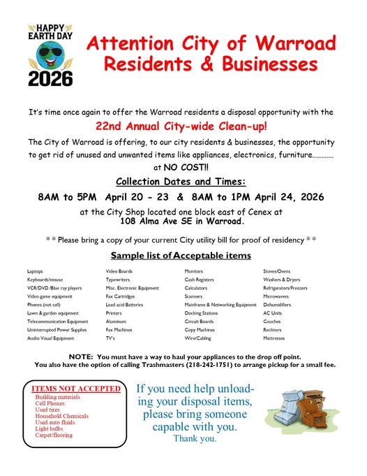 The City of Warroad is inviting residents and businesses to take part in the 22nd annual city-wide clean-up later this month. The free disposal event gives the community a chance to get rid of unwanted items like appliances, electronics and furniture. Collection runs from 8 a.m. to 5 p.m. April 20th through the 23rd, and from 8 a.m. to 1 p.m. on April 24th at the City Shop on Alma Avenue Southeast. Participants must bring a current city utility bill for proof of residency. Building materials, household chemicals and light bulbs will not be accepted. Residents must haul items to the site or arrange pickup through Trashmasters.